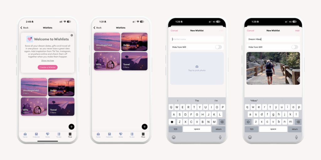 We created Wishlists so couples have that ONE place where they can create, share and collaborate on everything they want to do as a couple. From amazing date nights, weekends away and travel, or even hacks around the home and gifts – if you can dream it, you can create it in Cupla.
